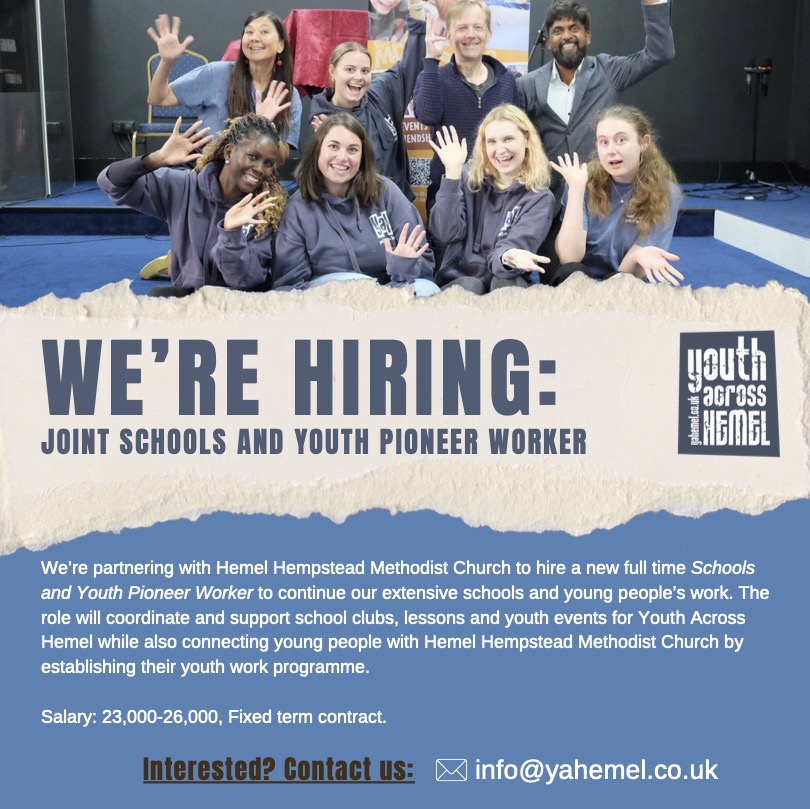 We are looking to appoint a new Joint Schools and Youth Pioneer worker to continue our extensive schools and young people’s work. This is a full time, or near full time position, in which 50% of their hours are committed to working in Hemel Hempstead Methodist Church (HHMC) as a Young People’s Pioneer worker.