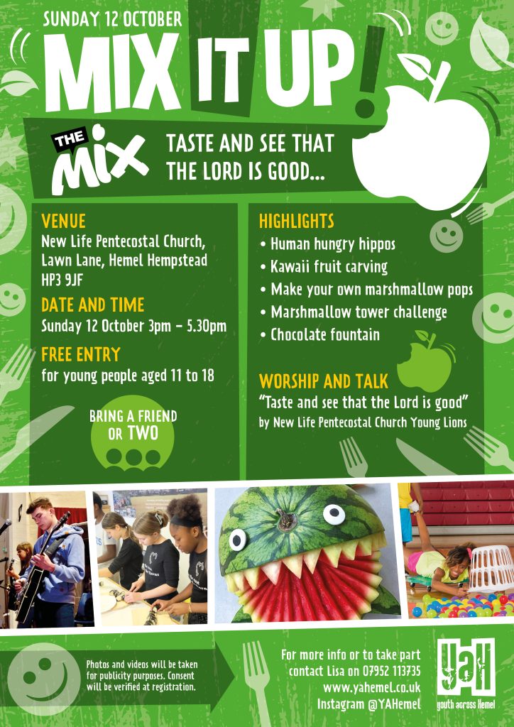 A host of foody themed fun and games at our next Mix include the rollerboard game Human Hungry Hippos, learning kawaii fruit carving ideas, making marshmallow pops and more. We’re super excited that the youth group at New Life Pentecostal Church – the Young Lions- will lead worship and share the message: “Taste and see that the Lord is good.” Don’t miss out and bring a friend too – we’re really looking forward to seeing you there!
